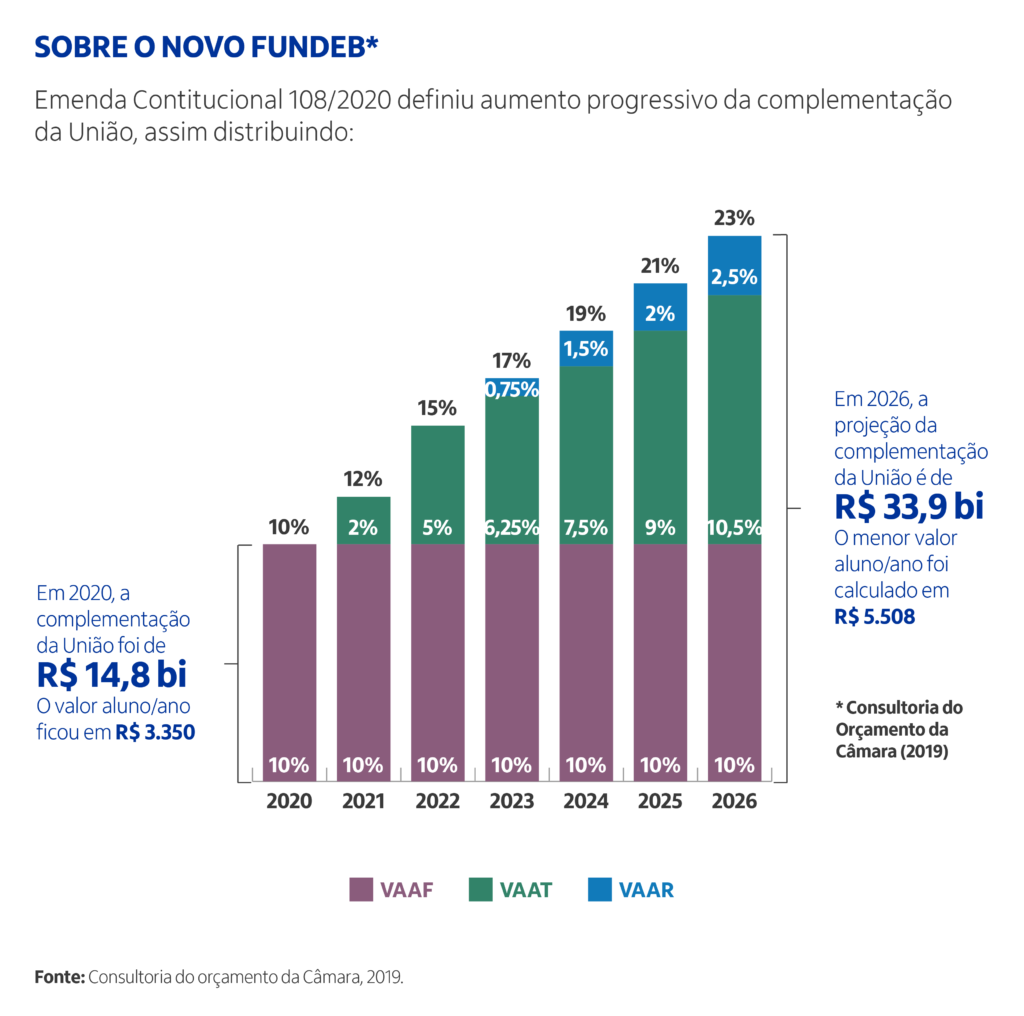 - A Emenda Constitucional n° 108/2020 e a Lei n° 14.113/2020 trouxeram inovações ao Fundeb. A complementação-VAAR (Valor Anual Total por Aluno/Resultado) é uma delas, e trata-se de um recurso destinado às redes públicas que cumprirem um conjunto de condicionalidades relacionadas à melhoria na gestão e que alcançarem a evolução dos indicadores de melhoria da aprendizagem com redução das desigualdades. A complementação de recursos será distribuída a partir de 2023 e corresponderá, neste primeiro ano, a 0,75% do valor total da contribuição dos Estados, Distrito Federal e Municípios aos 27 Fundos estaduais.