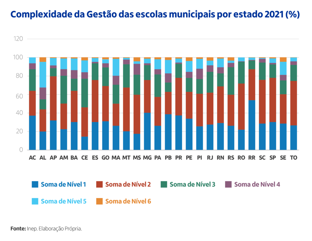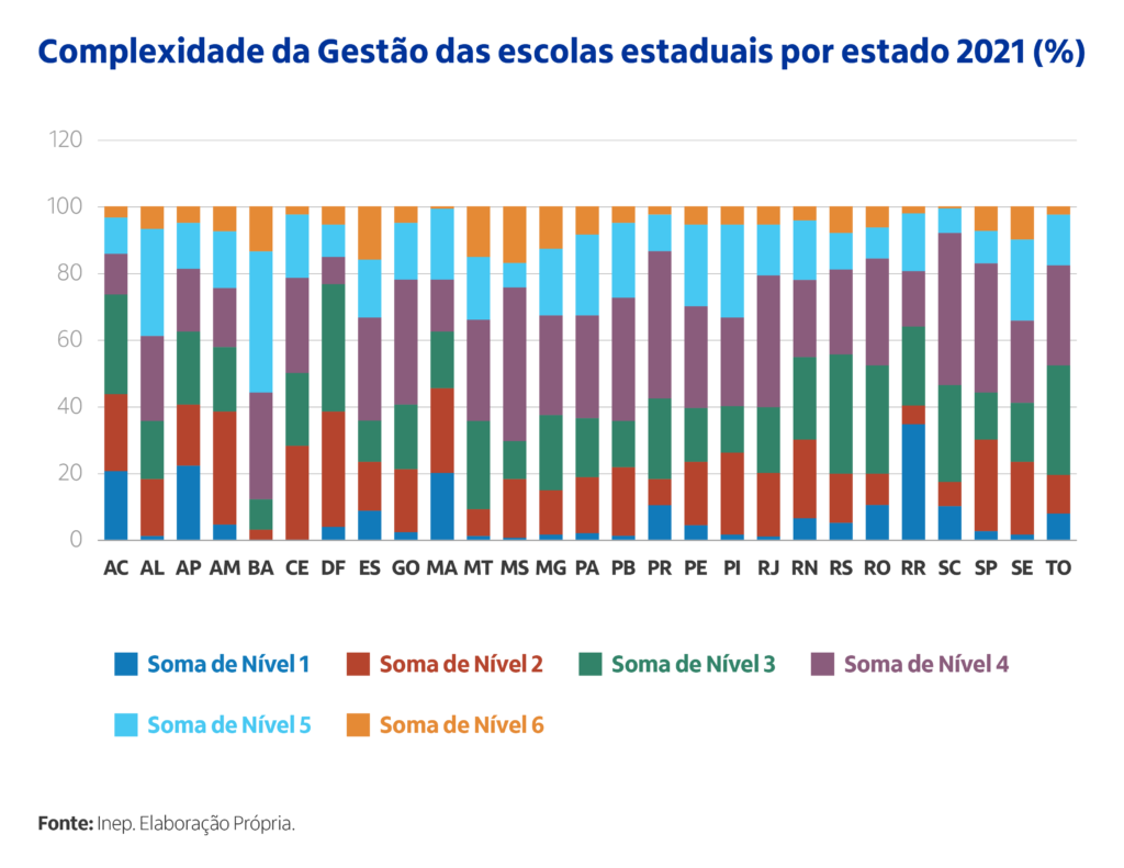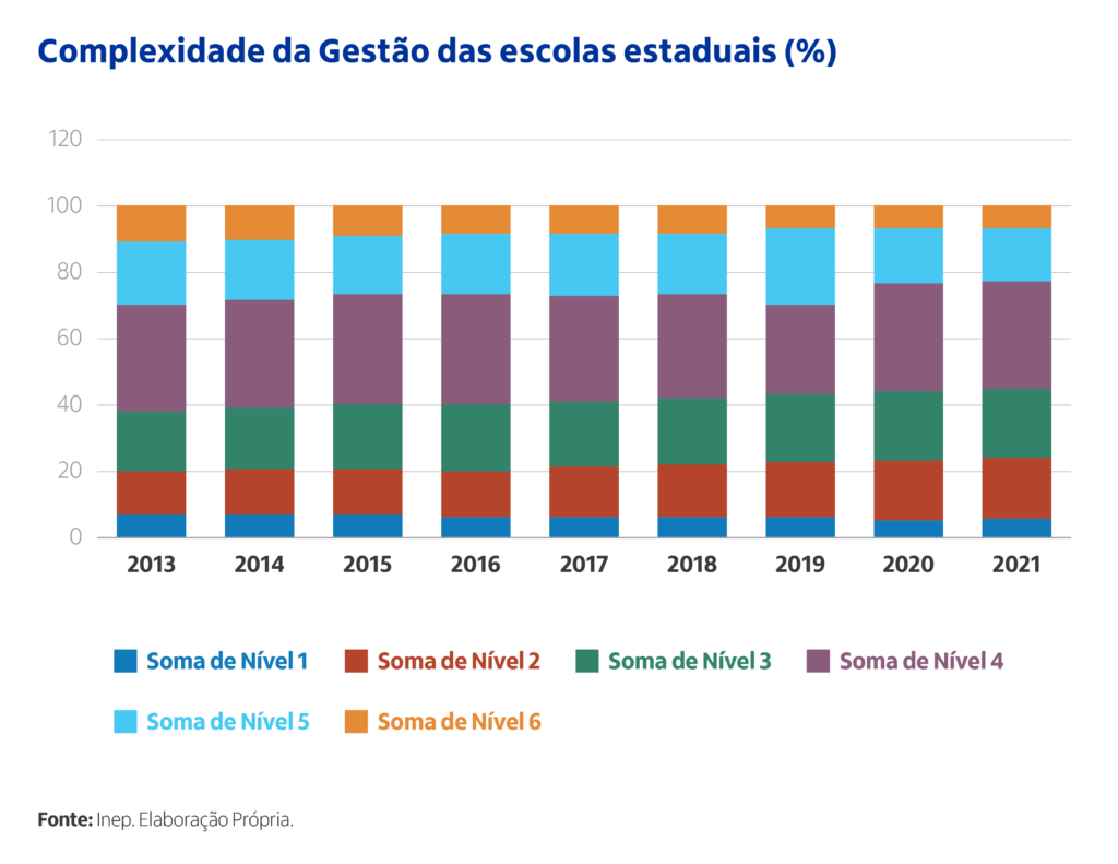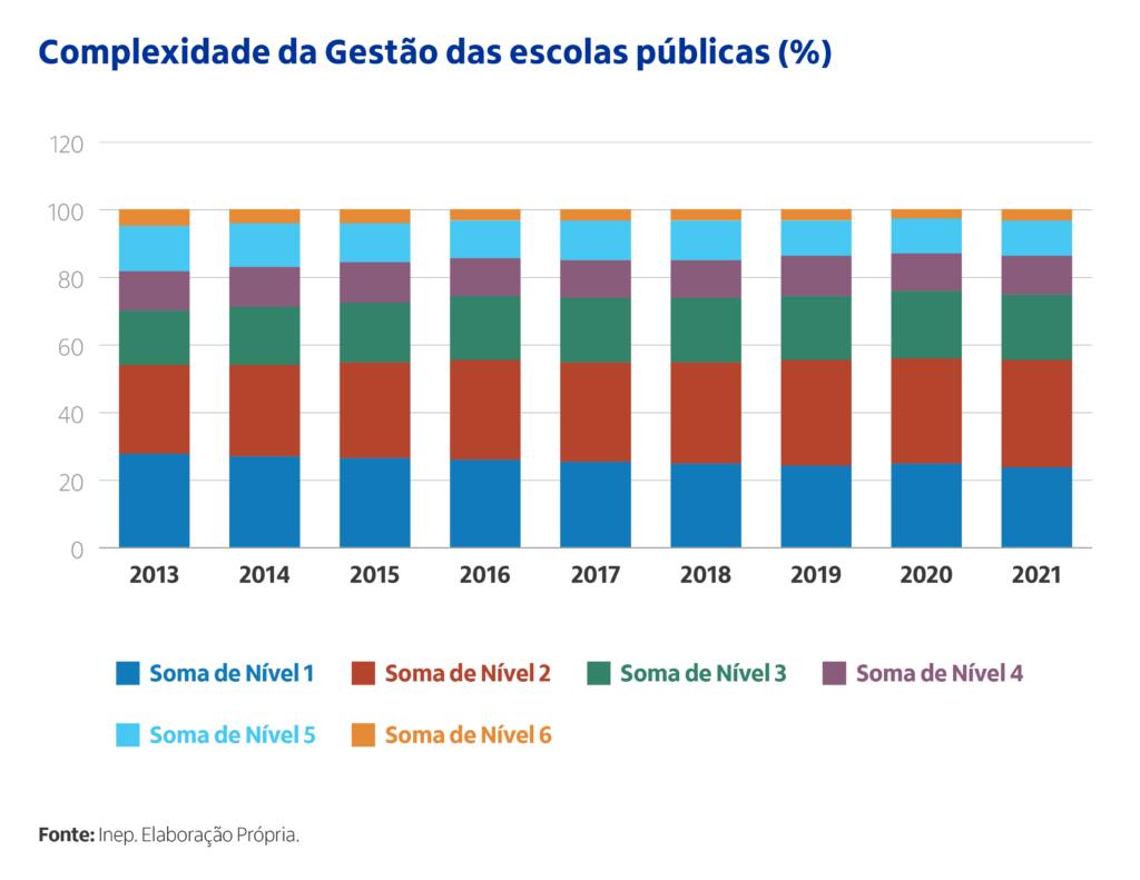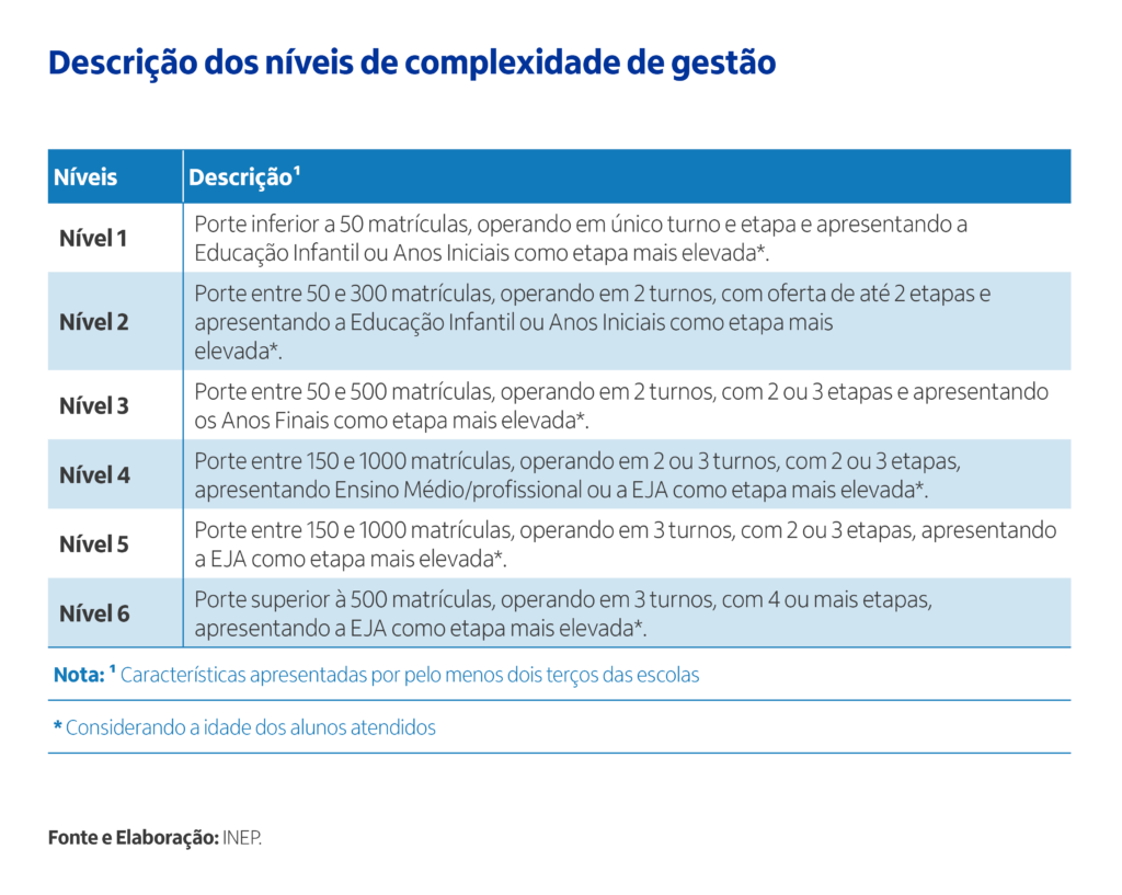 O indicador de Complexidade da Gestão é calculado pelo INEP com base nos dados do Censo Escolar. As variáveis que compõem o indicador para calcular os níveis de complexidade são: (1) porte da escola; (2) número de turnos de funcionamento; (3) complexidade das etapas ofertadas pela escola e (4) número de etapas/modalidades oferecidas. O indicador classifica as escolas em quatro níveis de complexidade, em que os níveis mais elevados indicam maior complexidade de gestão. Sendo assim, podemos compreender os níveis 1, 2 e 3 como de baixa complexidade e os níveis 4, 5 e 6 como de mais alta complexidade.