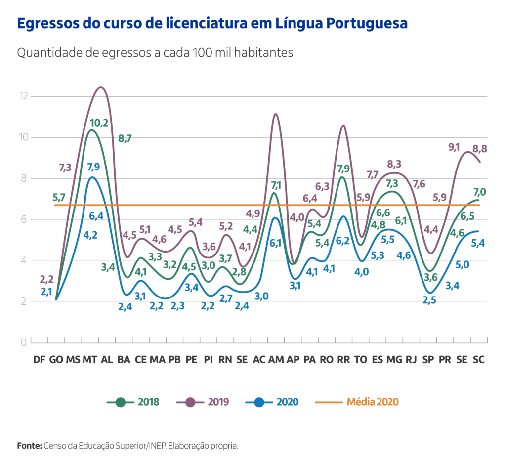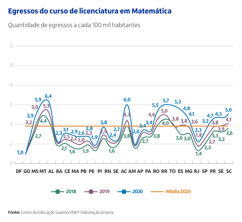 Resumo: Análise realizada a partir dos dados do Censo da Educação Superior para comparar a oferta de profissionais nas áreas de Língua Portuguesa e Matemática.
