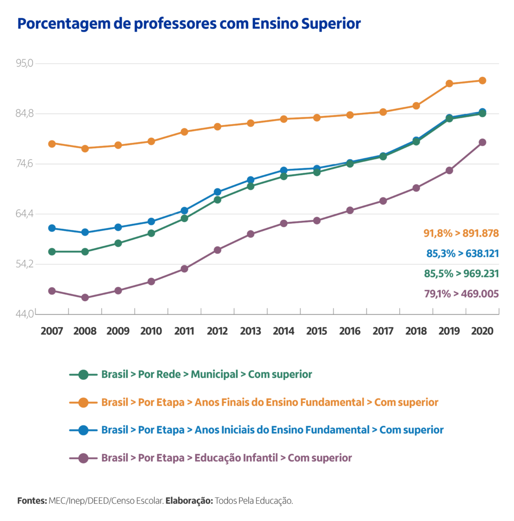 Já existe um consenso internacional que não há educação de qualidade sem professores bem preparados, motivados e com condições adequadas para ensinar (Barber e Mourshed, 2007; Bruns e Luque, 2015). Apesar de algumas conquistas importantes, como a lei do Piso Nacional e, a partir da BNCC, as Diretrizes Curriculares Nacionais para a Formação Inicial de Professores para a Educação Básica e a Base Nacional Comum para a Formação Inicial de Professores da Educação Básica, há ainda muito o que se fazer para que o Brasil chegue perto da meta 17 do Plano Nacional da Educação.