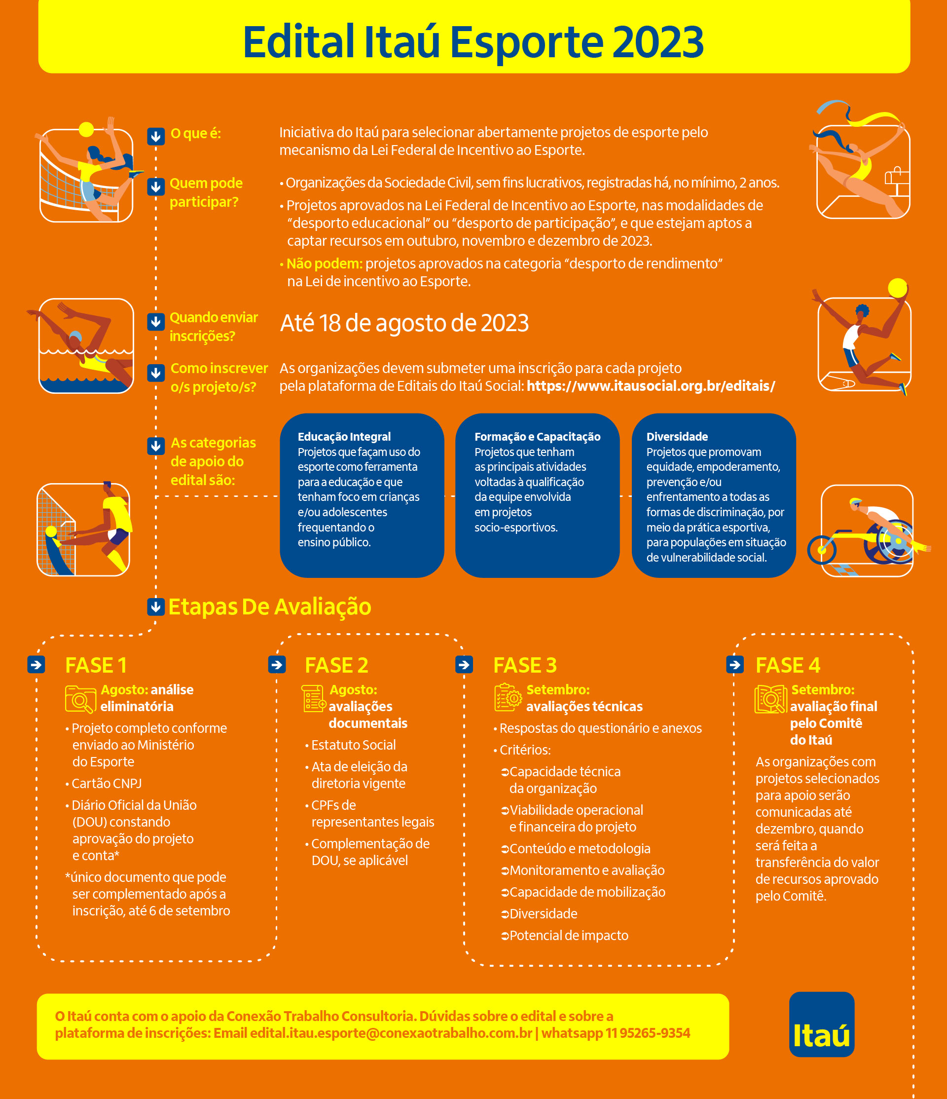 Financiamento de projeto habilitado pela Lei Federal de Incentivo ao Esporte. O Edital Itaú Esporte 2023 vai selecionar projetos esportivos nas seguintes categorias: