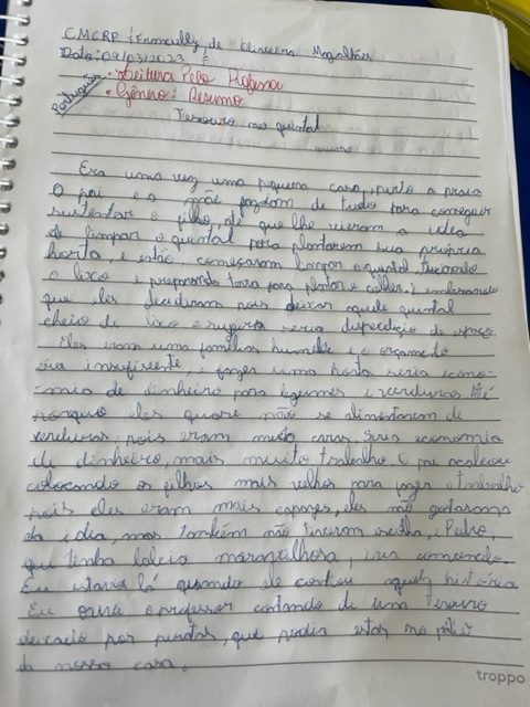 Com os mesmos alunos agora no 7º ano do fundamental em 2023, a professora Cláudia tem levado para a sala de aula também contos literários que são lidos por ela e pelos alunos durante as tertúlias. Eles continuam dedicados e procuram produzir textos na estrutura correta, de acordo com as orientações da professora. “Há ainda alguns erros e repetições de ideias, mas estamos trabalhando para que melhorem. A prática de relatar, redigir acontecimentos cotidianos ou mesmo expressar os sentimentos os torna mais autoconfiantes. Só tenho orgulho e alegria quando vejo a produção de alunos que eram do 6º ano e que hoje, no 7º, conseguem escrever textos tão bem elaborados.”