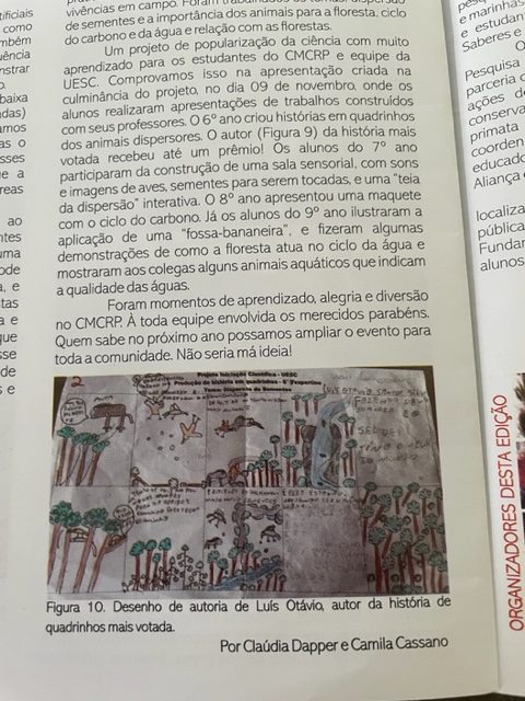 Outro aluno destacou-se em uma atividade em que todas as turmas do fundamental da escola, do 6º ao 9º ano, foram convidadas a redigir notícias que viram nos meios de comunicação para serem enviadas ao jornal da Universidade Estadual de Santa Cruz (Uesc), parceira da escola, para que os responsáveis publicassem o trabalho vencedor. A turma da professora Cláudia deveria escrever sobre meio ambiente e sustentabilidade, além de relatos sobre o lugar onde moram. O vencedor foi seu aluno Luis Otávio Santos Silva. “Ele escreveu e desenhou uma história em quadrinhos sobre um tema proposto num projeto de semana da ciência realizado em parceria com a Uesc.”